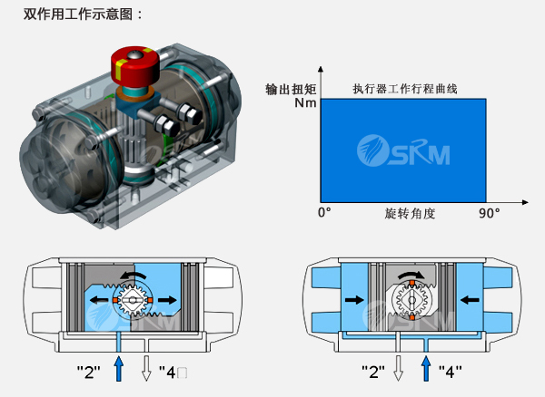 當(dāng)氣源壓力從氣口(2)進(jìn)入氣缸兩活塞之間中腔時(shí),使兩活塞分離向氣缸兩端方向移動(dòng),兩端氣腔的空氣通過(guò)氣口(4)排出,同時(shí)使兩活塞齒條同步帶動(dòng)輸出軸(齒輪)逆時(shí)針?lè)较蛐D(zhuǎn)。反之氣源壓力從氣口(4)進(jìn)入氣缸兩端氣腔時(shí),使兩活塞向氣缸中間方向移動(dòng),中間氣腔的空氣通過(guò)氣口(2)排出,同時(shí)使兩活塞齒條同步帶動(dòng)輸出軸(齒輪)順時(shí)針?lè)较蛐D(zhuǎn)。(如果把活塞相對(duì)反方向安裝,輸出軸即變?yōu)榉聪蛐D(zhuǎn))
