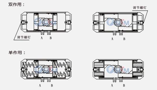 當(dāng)壓縮空氣從A管咀進(jìn)入氣動(dòng)執(zhí)行器時(shí),氣體推動(dòng)雙活塞向兩端(缸蓋端)直線運(yùn)動(dòng),活塞上的齒條帶動(dòng)旋轉(zhuǎn)軸上的齒輪逆時(shí)針方向轉(zhuǎn)動(dòng)90°,閥門即被打開。此時(shí)氣動(dòng)執(zhí)行器兩端的氣體隨B管咀排出。反之,當(dāng)壓縮空氣從B管咀進(jìn)入氣動(dòng)執(zhí)行器的兩端時(shí),氣體推動(dòng)雙塞向中間直線運(yùn)動(dòng),活塞上的齒條帶動(dòng)旋轉(zhuǎn)軸上的齒輪順時(shí)針方向轉(zhuǎn)動(dòng)90°,閥門即被關(guān)閉。此時(shí)氣動(dòng)執(zhí)行器中間的氣體隨A管咀排出。以上為標(biāo)準(zhǔn)型的傳動(dòng)原理。根據(jù)用戶需求,氣動(dòng)執(zhí)行器可裝置成與標(biāo)準(zhǔn)型相反的傳動(dòng)原理,即旋轉(zhuǎn)軸順時(shí)針方向轉(zhuǎn)動(dòng)為開啟閥門,逆時(shí)針方向轉(zhuǎn)動(dòng)為關(guān)閉閥門。